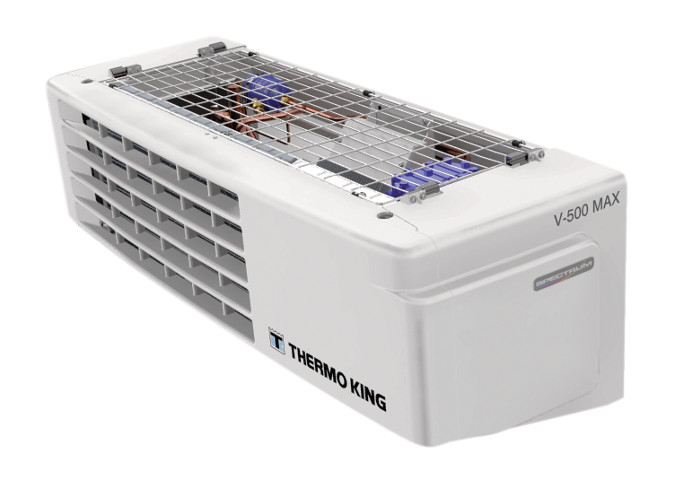 The V-500 MAX Spectrum offers multi-temp cooling for medium trucks (up to 22m3), with a nose-mounted, all-aluminum condenser, with a 60% capacity increase over the V-300 MAX Spectrum. Draws power directly from the vehicle engine, but with optional electric grid back up.
